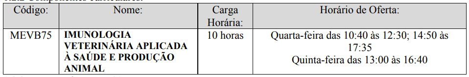 1.2.1. Titulação Mínima: Mestrado em Medicina Veterinária ou áreas afins com dissertação de mestrado com tema relacionado à Imunologia Veterinária.