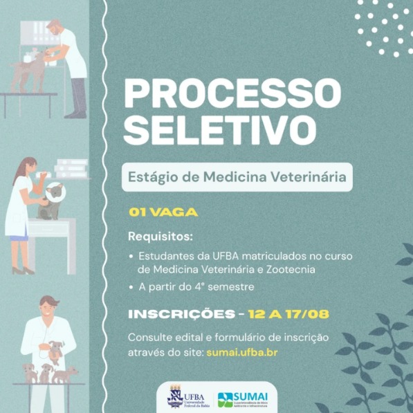 A Sumai está disponibilizando uma vaga de estágio de Medicina Veterinária. A oportunidade é para alunos matriculados na Universidade Federal da Bahia.